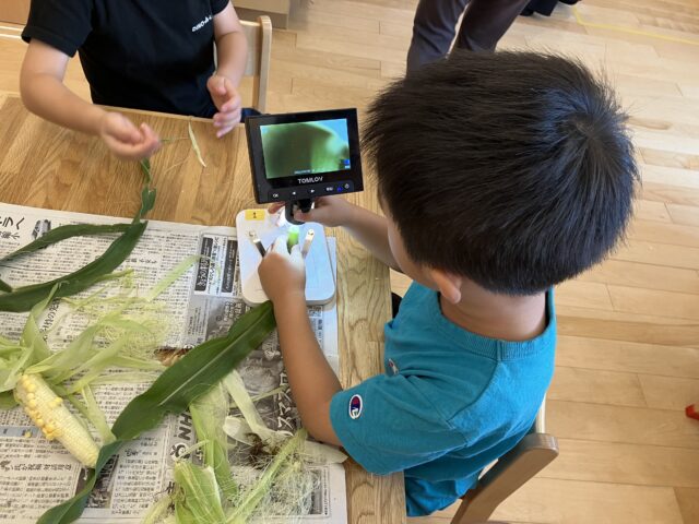 2025.07.8 保育園の日常、大岡山園 トウモロコシの観察 畑で採れたトウモロコシの観察をしました。 匂いは?硬さは?皮を剥いた時の実はどうなっている? などなど、子どもたちの不思議がたくさん。 「顕微鏡出して見てみない?」と自然と子どもたちから顕微鏡の言葉も出て、細部まで観察。 「茹でるとどうなる?」という事で、実際に茹でてみることに… 「おぉ!いい匂い!」「色が濃くなった!」と変化を楽しみました。