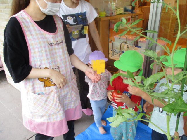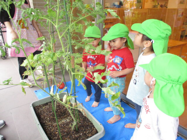 2025.07.17 保育園の日常、西葛西園 トマト🍅収穫したよ 自分たちが植えたトマト🍅が美味しそうに出来上がりました♡ 収穫・・・1個だけど♬大喜び オクラはまだまだ小さいね トマト🍅食べごろ お給食に食べました♡甘くて美味し~と喜んで食べていました。