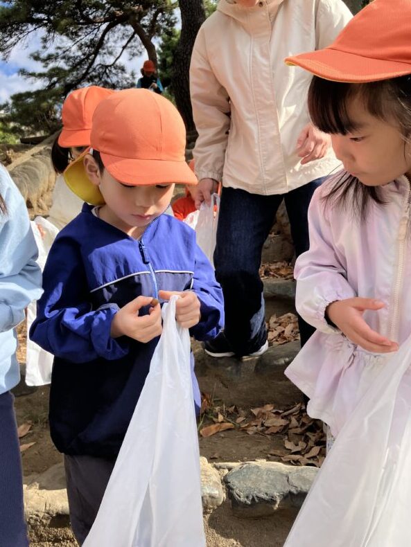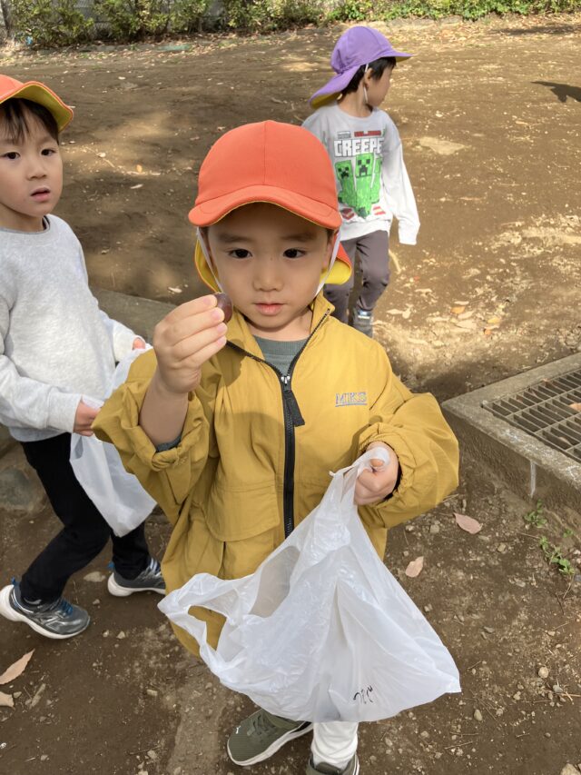 製作でドングリ、松ぼっくりを使うため、公園に拾いに行きました。