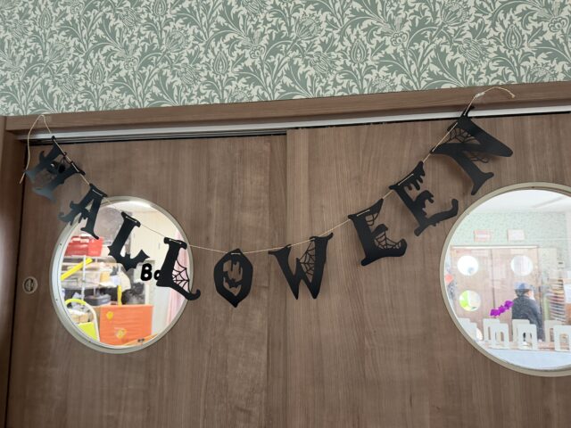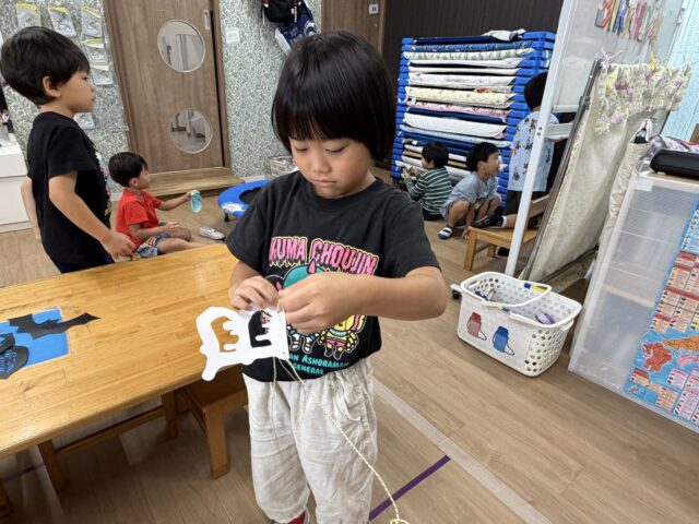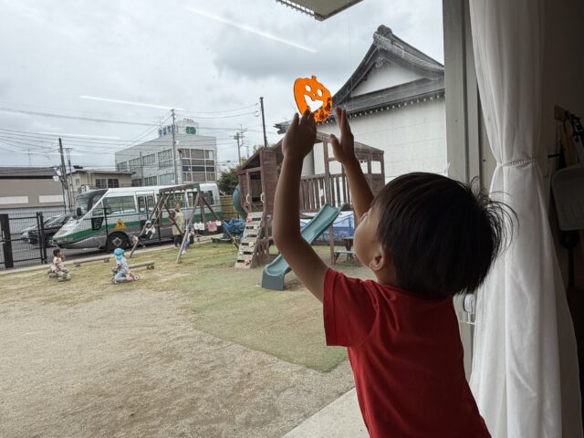 2025.10.11 保育園の日常、誉田保育園 ハロウィンの飾り付け☆4歳児 ハロウィンの飾り!!どこに貼ろうかな!! 「小さい子が手が届くかも?」「そうだね、高い方に貼ろうよ」 「椅子に登ればいいんじゃない??」 「ぼくはこれがお気に入り~」 センスの光る貼り方!!ハロウィンっぽくなってきました。 ガーランドに紐を通します。「簡単にできるよ!!」 少し怖めのガーランドも人気でした!!もうすぐ運動会ですが、10月といえばハロウィン!!飾り付けをしながら、楽しみに待ちたいと思います。