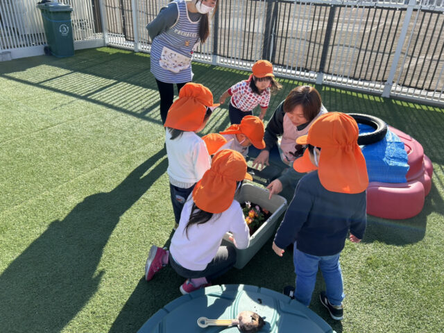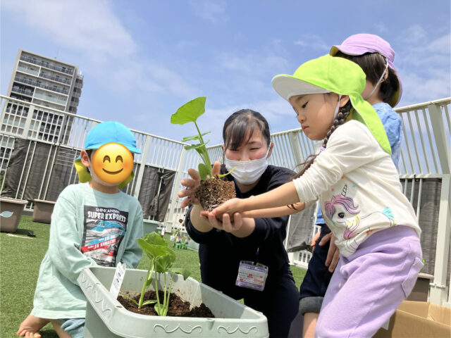 とうきょうすくわくプログラム事業利用で屋上園庭の一角に、ビオトープを作りました。キッズラボ中延園では、自然と共生プロジェクトが進行中。日々の保育の中で、自然の中に生かされていること、命をいただいて生きていること、そして自分たちの手で自然を育て守ろうとすること、様々な必然や偶然に気付き体験していきたと願っています。