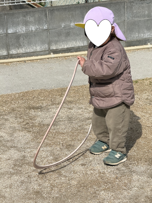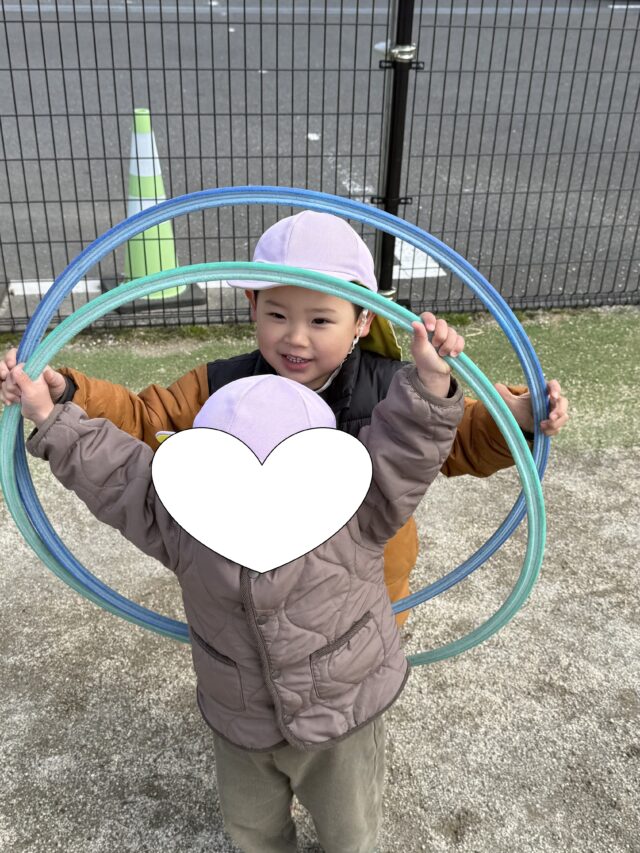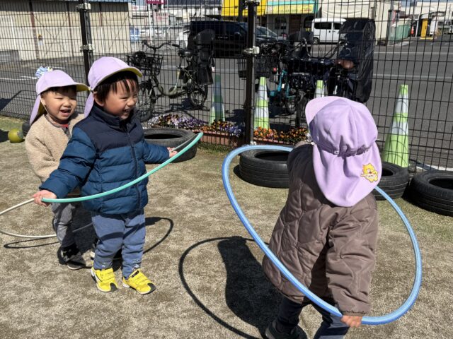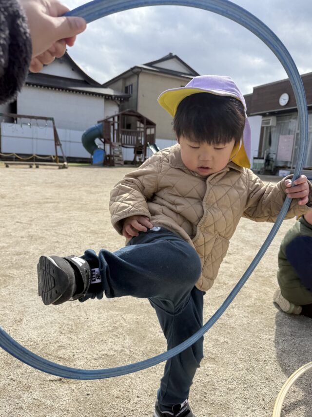 2026.03.14 保育園の日常、誉田保育園 フープで遊ぶの楽しいね♡2歳児♪ フープを転がそうっと! そーっと…そーっと… 「こうやって転がすと、まっすぐ進むんだ!」 フープをまたいでみよう!高さがあるけど、できるかな・・・♪ フープが電車に変身♪タイヤのでこぼこ道も進むよ~♪ 「ぼくは大好きな はやぶさ~」 「連結しまーす♪」次々と電車が繋がっていきますねー♪ 「あっ!おんなじ丸だ!」お友だちが持っていたフープと同じ形ということに気が付くと、とても嬉しそうでした♪ これからもたくさんフープを使って遊んだり、新たな発見を楽しんでいこうね♪