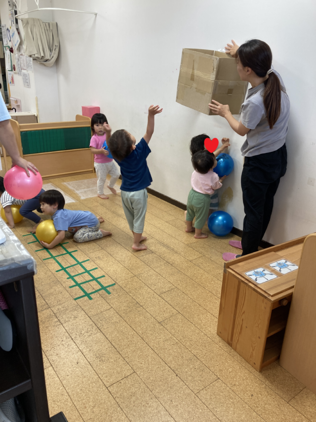 2025.07.24 保育園の日常、西馬込小規模保育園 ボール遊び 今日は、人数が少なかったため 合同保育を行いました。 段ボールでゴールを作り、その中へボールを入れ遊びました。 なかなかボールが入らず、何度もチャレンジ。 チャレンジしているうちに、入るようになってきた子もいました。