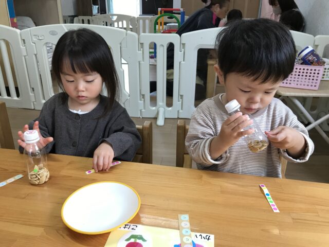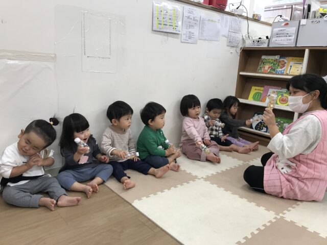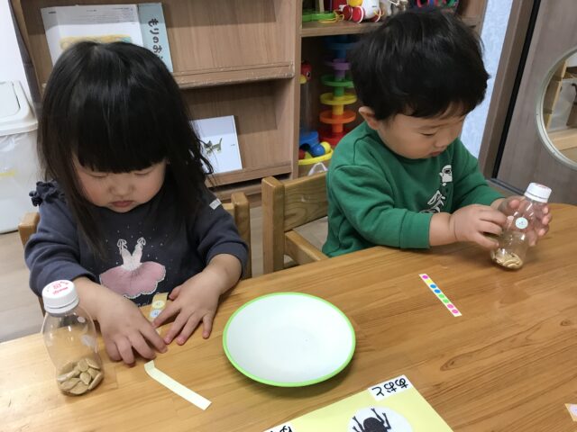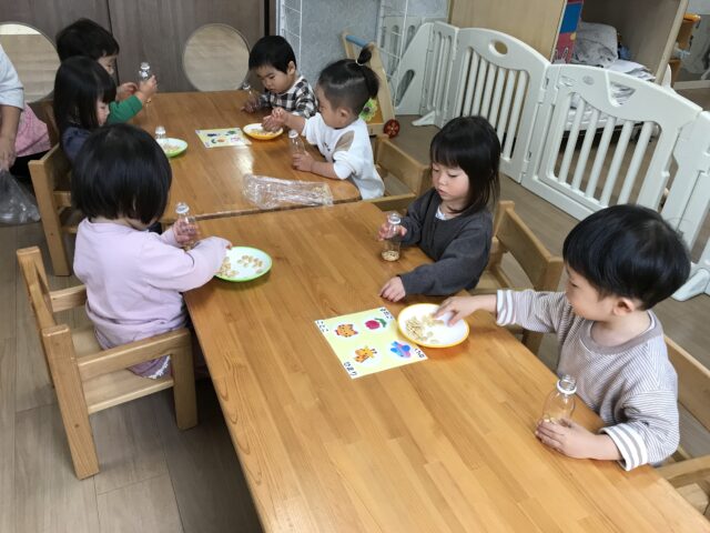 2025.11.8 保育園の日常、誉田保育園 マラカス作り♪1歳児♪ 以前、食育でかぼちゃの種とりをした、かぼちゃの種でマラカス作りに挑戦♪ かぼちゃの種が入った容器にシール貼り♪ シールとれるかな・・・ 指先を使って上手にシールをはがして貼ります♡ ペタペタ♡ 完成♡ みんなで作ったマラカスで、曲に合わせて歌ってみよう♡ 音がなるのは楽しいね♡