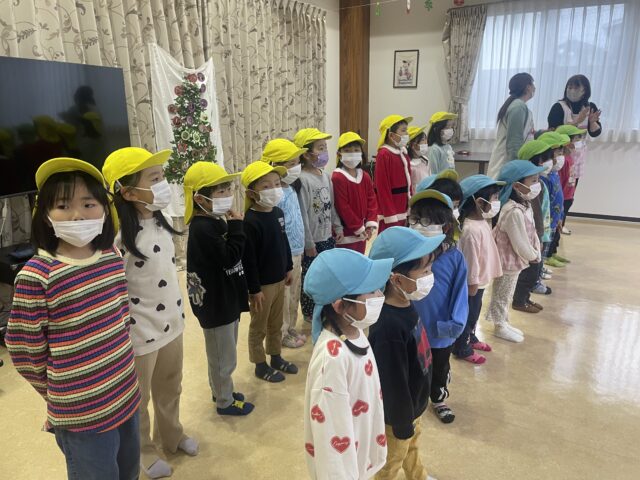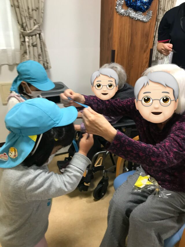 2025.12.31 保育園の日常、誉田保育園 ロイヤルアスコット(老人ホーム)でのクリスマス会🎅以上児♪ 地域の交流でロイヤルアスコットの方と行事を一緒に計画して、ハロウィンの時期は雨で行くことができず、クリスマス会当日は雨も降らずに元気に出発♪たくさん元気をあげてこようね♪ たくさんのおばあさん、おじいさんがいて緊張したね! おばあさん、おじいさんにプレゼントしたくて折り紙で制作したサンタクロース♡ 「はいどうぞ!」照れながらも握手して渡せましたよ♡ おばあさん、おじいさんからも素敵なメダルを首に下げていただきました! みんなで作った大きいリースをプレゼントをしました♪サツマイモのツルで作ったリース♪交流会を通して子どもたちも優しい気持ちになったこと、また経験になったこと、誉田保育園でたくさんの交流を通して子どもたちがたくさんの経験をしていきたいと思います♪ ロイヤルアスコットのみなさんありがとう♡