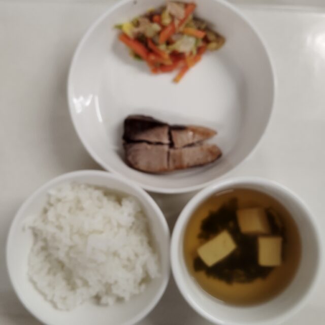 2025.12.19 ある日の給食 下丸子園 給食 御飯、ブリの照り焼き、白菜とツナの胡麻和え、豆腐のすまし汁 魚屋さんが持ってきてくれた大きなブリを目の前で切ってもらって、給食で食べました。とてもよく食べました。