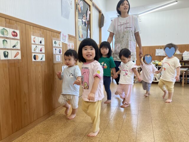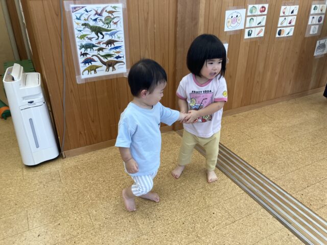2歳児のお友だちは、小さいお友だちをエスコートする場面が見られました。