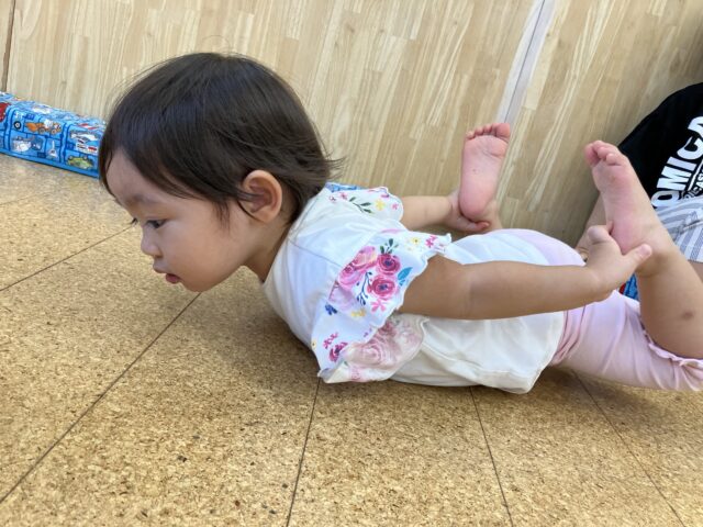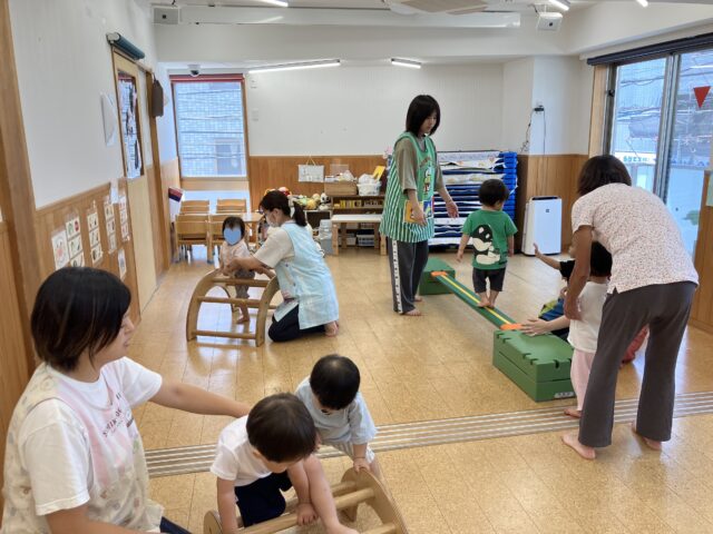 残念ながら、地域の方のご参加はありませんでしたが、1歳児のお友だちはお兄さんお姉さんの真似をしながら、リトミックや手遊び、巧技台を行いました。