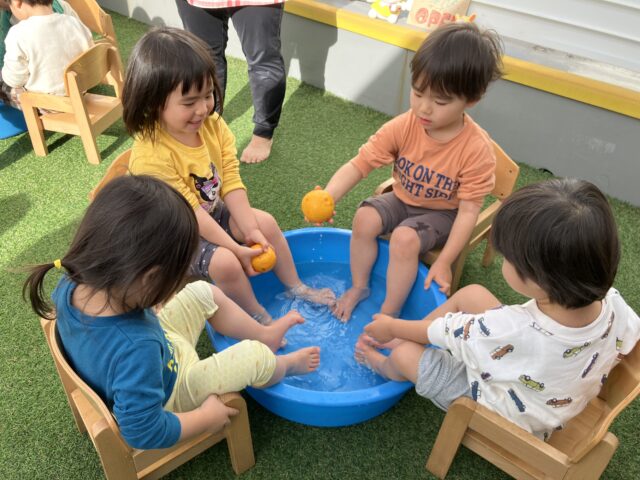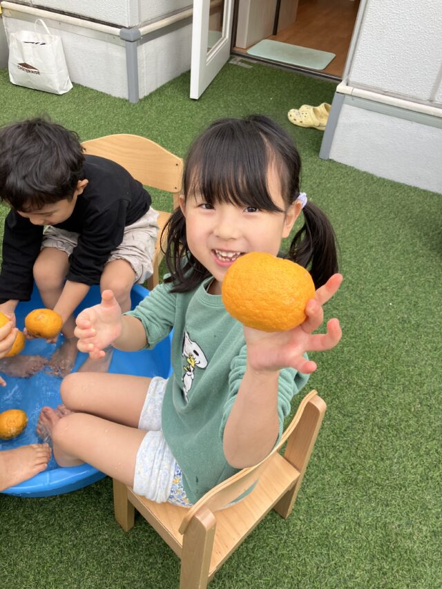このゆず湯も今年で5回目。幼児クラスの子どもたちは「これ、前も入ったよね!」と昨年のことを思い出しながら、椅子に座るとすぐに足をお湯の中へ。