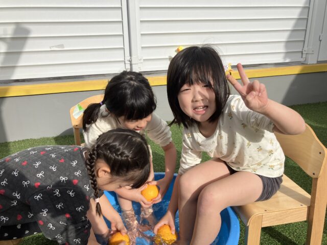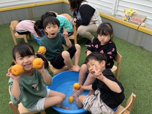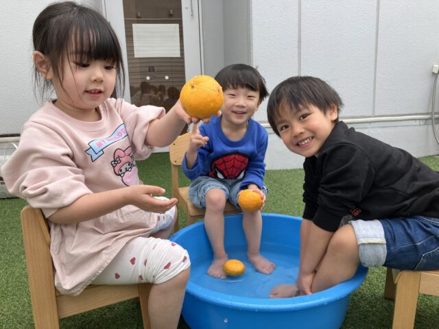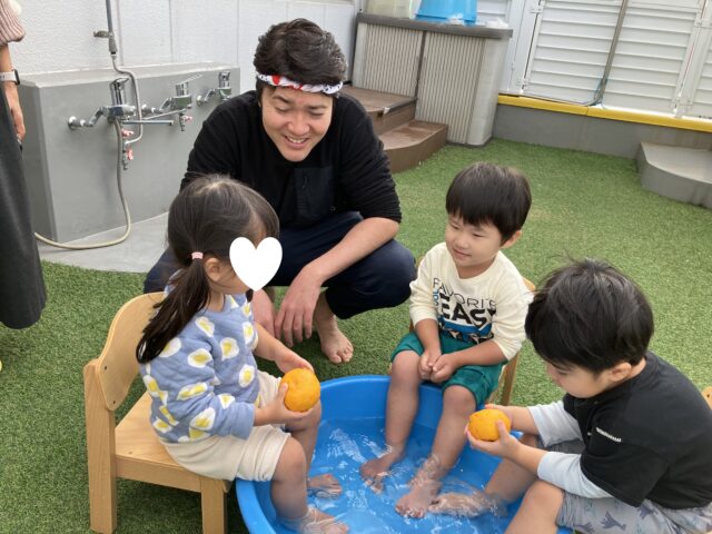 今年も冬至の日に、キッズラボ蓮沼園の屋上でゆず湯(足湯)を行いました🍊