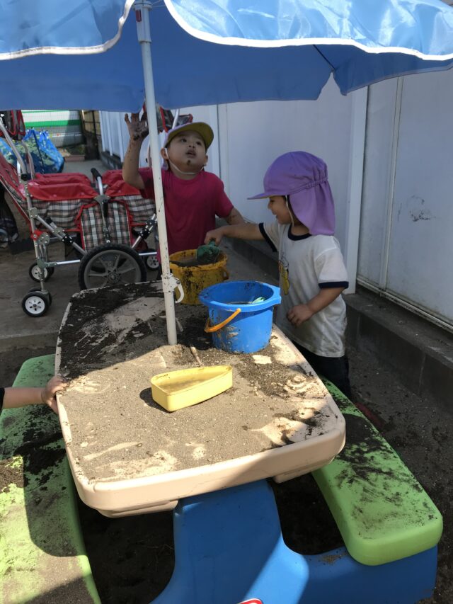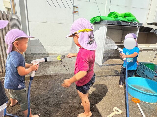 2025.09.29 保育園の日常、誉田保育園 今年度最後のどろ遊び☆2歳児 雨どいを繫げて、玩具を流し、水の流れを楽しみ、大興奮です!! 「まてまて~~」何が流れていくのかな?楽しそうに追いかけてますね~~ 「ホースとホースで水かけ合戦!!」水の掛け合いも激しく、全身ビショビショです。。 テントテーブルの下ではお店屋さんが。。「チョコのジュースですよ~」と可愛らしい店員さん。美味しいかな?? たくさん遊んだ後は「どろ温泉に浸かって、一休み。。」気持ちよさそうですね。今年も泥んこ遊びをダイナミックに楽しんだ子ども達。元気いっぱい!笑顔いっぱい!楽しかったね。また来年も楽しもうね。