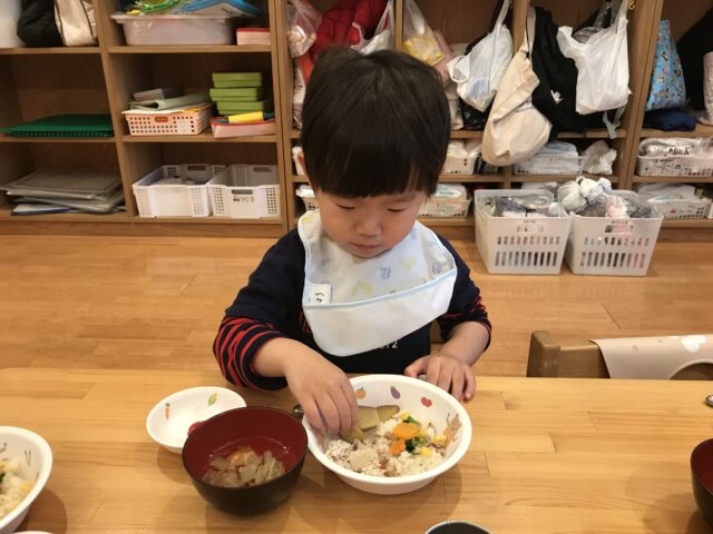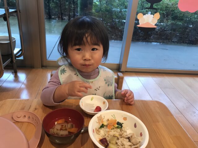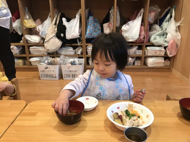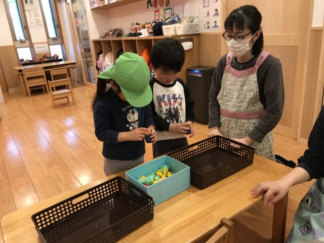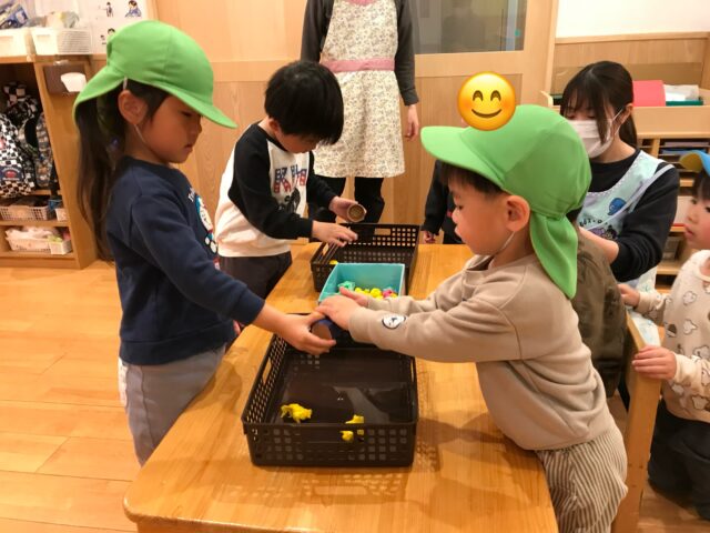 りんご組さんは幼児組さんと一緒に2つチームに分かれて「ひなあられレース」楽しみました!どっちがひなあられを沢山獲得できるかな?幼児組さんに負けじと頑張る子どもたちでした😉