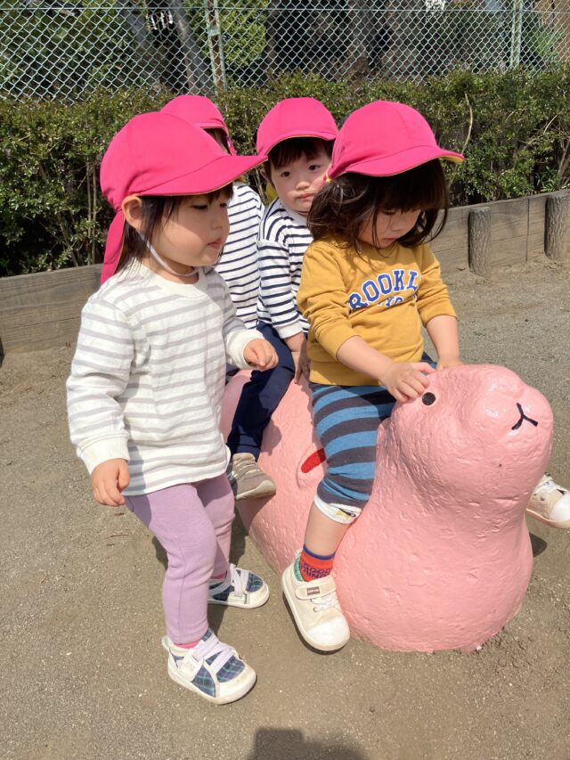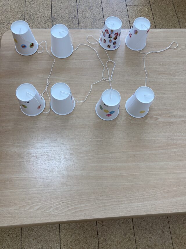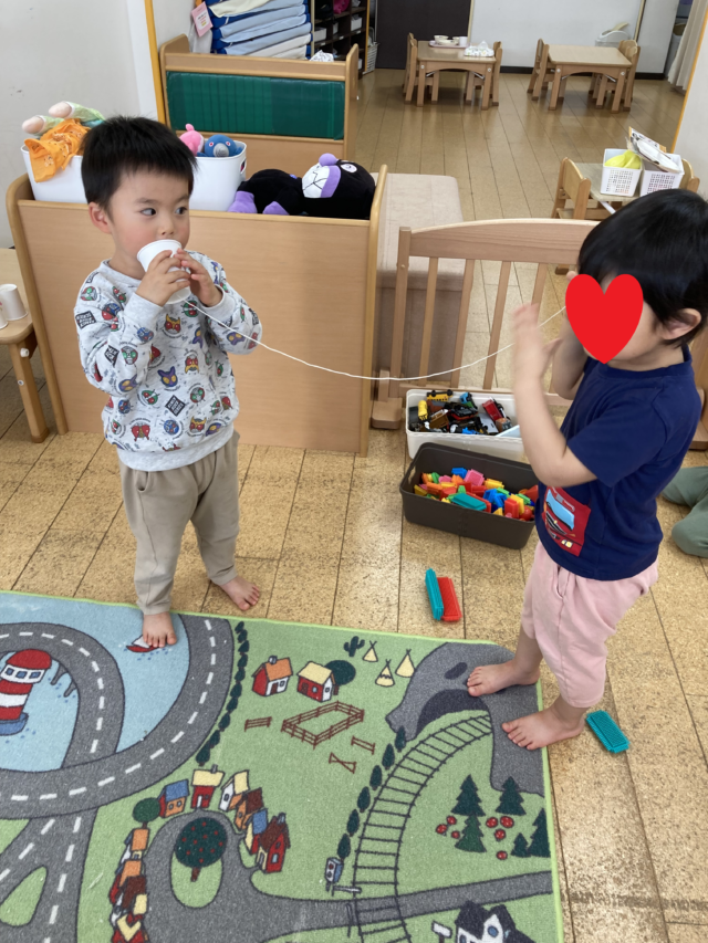 2025.03.27 保育園の日常、西馬込小規模保育園 今日も沢山遊んだね! 1歳児クラスは公園で元気に遊びました。 公園の遊具のペンキが塗り替えられていて 子どもたちはすぐに分かった様です。 鮮やかな色にきっと子どもたちも弾んだ事でしょう! 2歳児クラス 「おーい きこえるかーい!」 糸電話を作り遊びました。