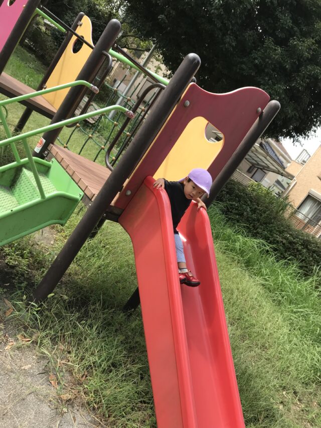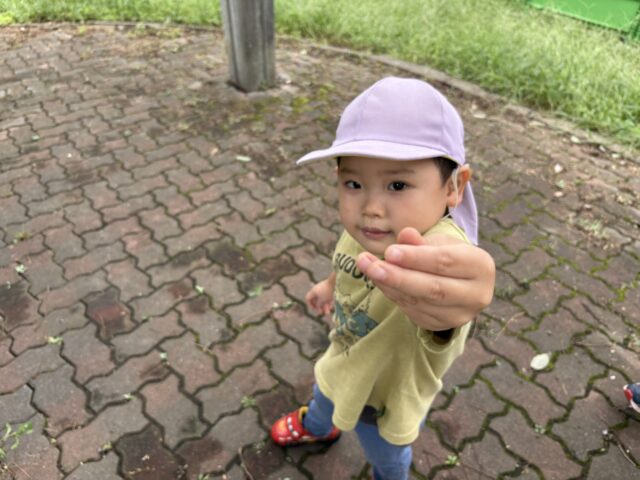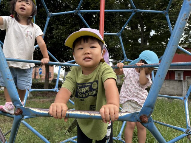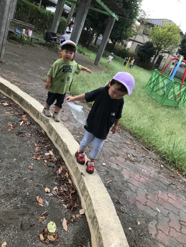2025.09.21 保育園の日常、誉田保育園 公園に散歩にいきました☆2歳児 気温が低くなってきたので、久々に公園へ遊びに行きました 上に何かの虫を発見!!なんかジージーって鳴いてるよ♪ 「先生!!見て見て!」ダンゴムシをゲットしました。大興奮です 久しぶりの公園!楽しいね バランスとって~落ちないように慎重派ですね。。