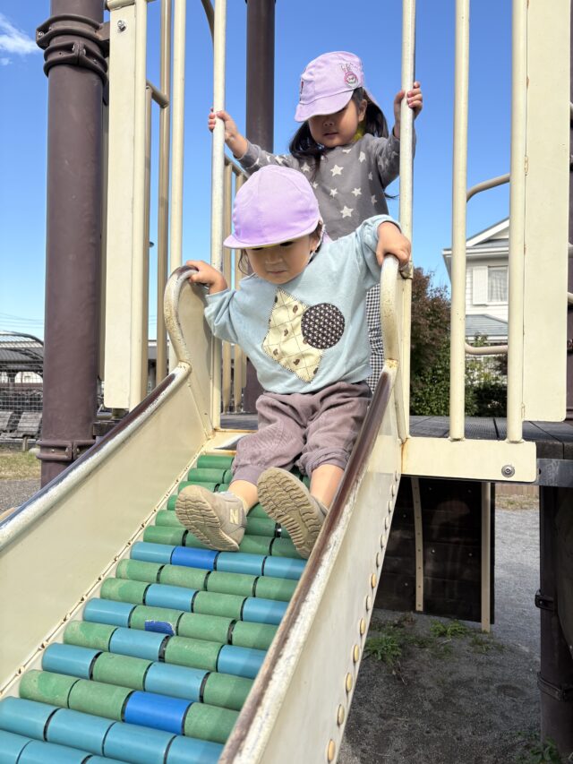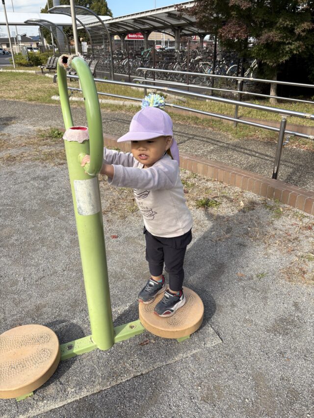 2025.11.15 保育園の日常、誉田保育園 公園に行ってきたよ♪2歳児♪ 公園に到着したら、真っ先にすべり台へ♪「すべり台だいすきなんだ~♡」 「ぐるぐる まわるよー」不思議な遊具で大興奮♡ 「あっ ねこじゃらしだ~」「ふわふわしてるね♪」 「せんせー ながいよー」ねこじゃらしが気に入ったようです♡ この遊具も大人気♡ 「たのしいね~♪」 帰る時に電車が到着!「電車きたー♪」「近いねー♪」大好きな電車に大興奮♡ 誉田駅の階段の上り、降りも練習しています♪また公園で遊ぼうね♪