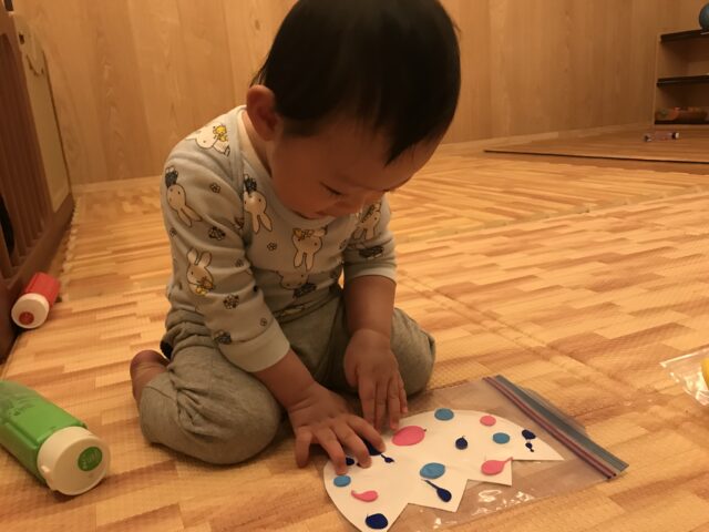 色を選んだ後は、いよいよ模様付け。ジップロックの中に入ったたまご型の画用紙を、モミモミしたり手でパンパン叩いてみたりしながら絵の具を伸ばしていきました✨