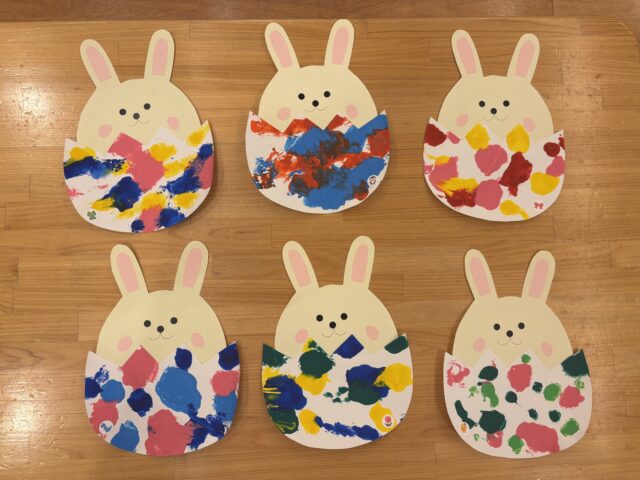 イースター製作のたまごの部分を、絵の具で模様付け。保育者が絵の具を目の前に並べると、自分から手を伸ばしていた子どもたち🎨