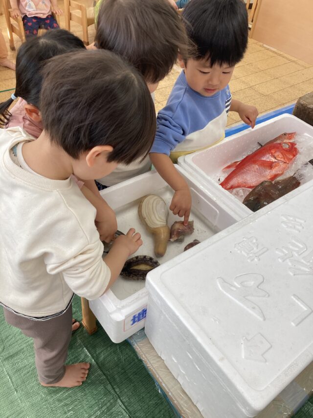 今度は、金目鯛・カレイ・ほうぼう・つぶ貝・北寄貝等々実際に触って楽しみました。