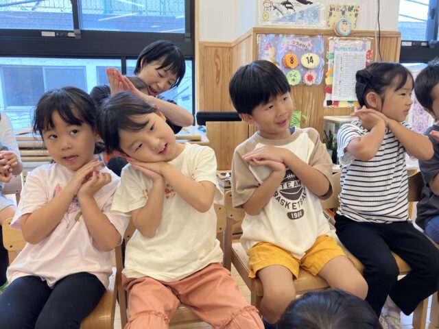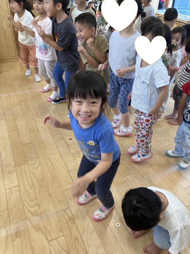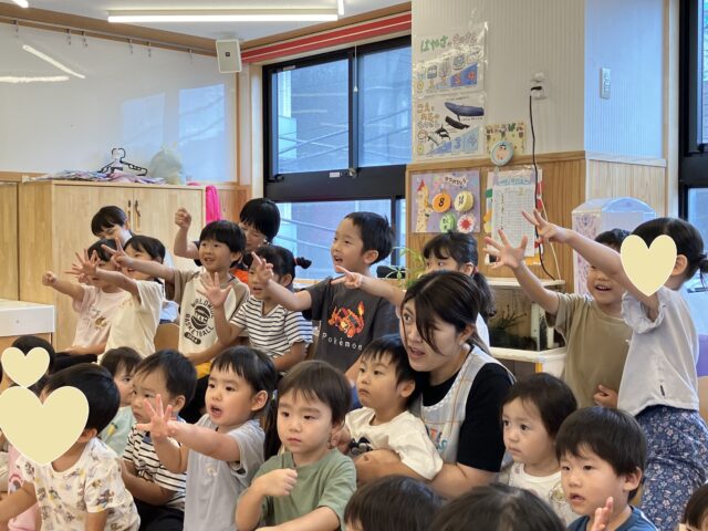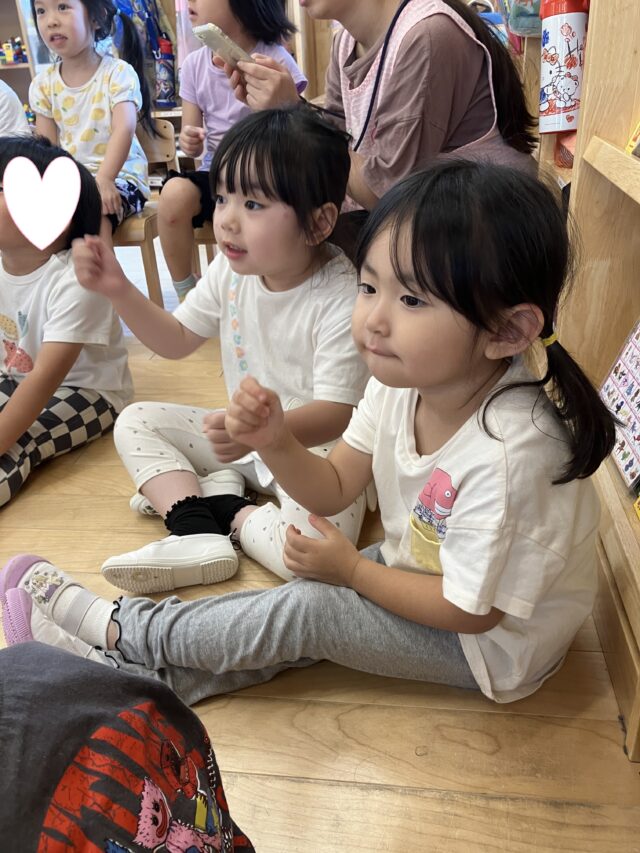 「おばけなんてないさ」や「アイスクリームのうた」など夏の歌を歌い、「狸のお札」というお話しを聞いた後にはみんなで手遊び歌を楽しみました。