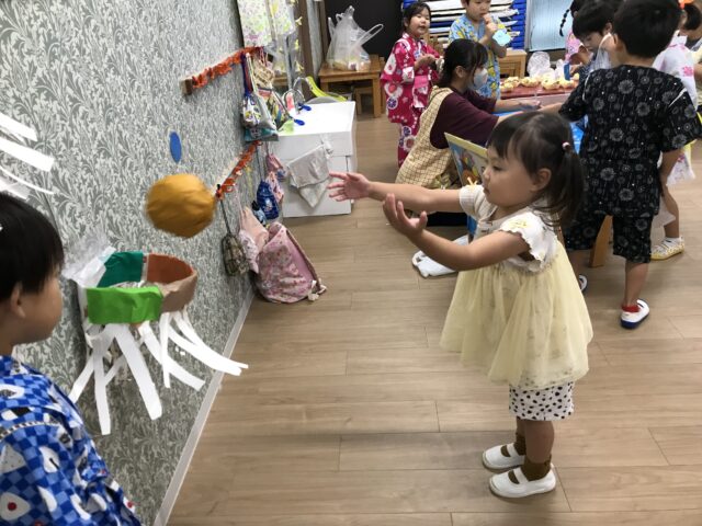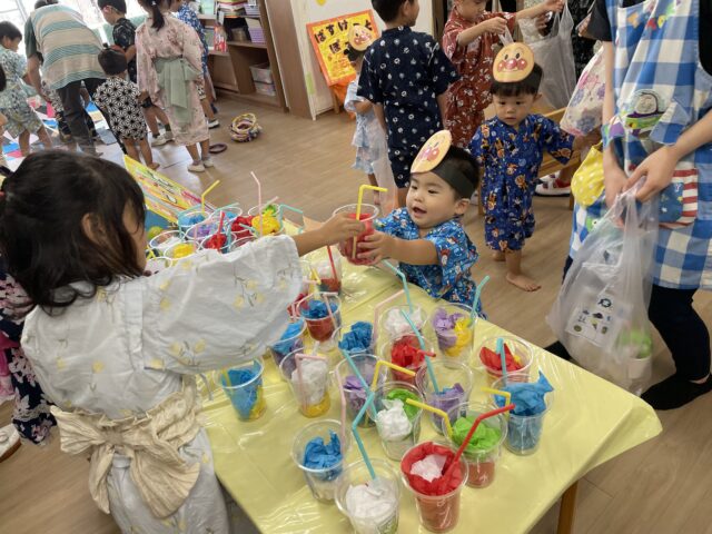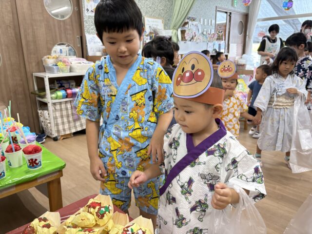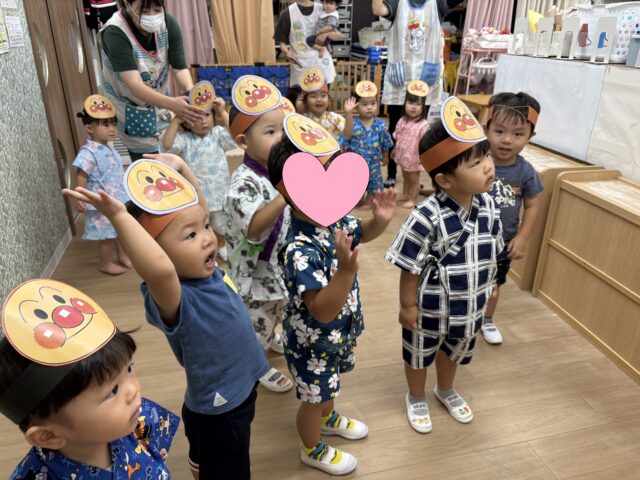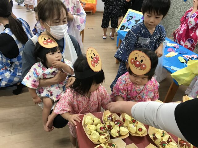待ちにまった、夏祭り!未満児はアンパンマンのお面を付けて夏祭りに参加します