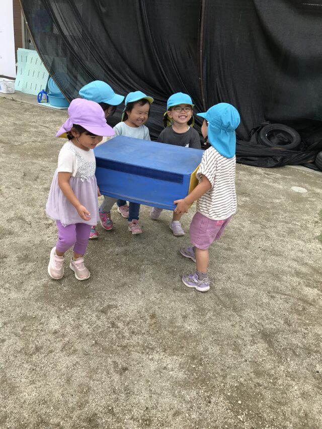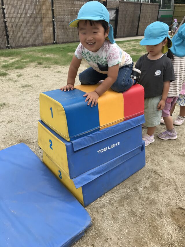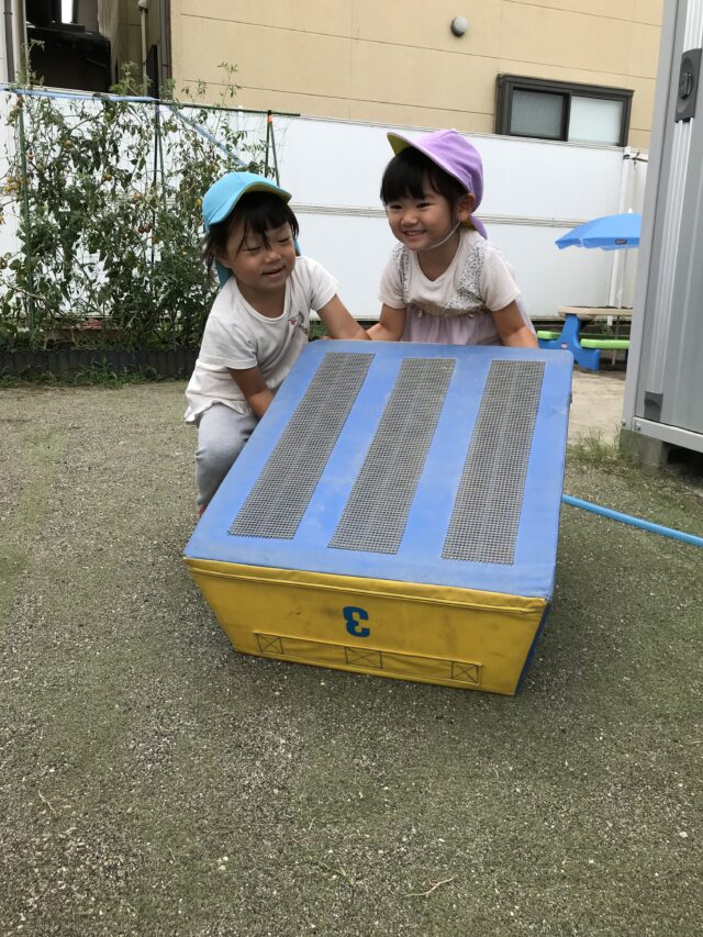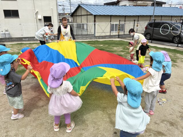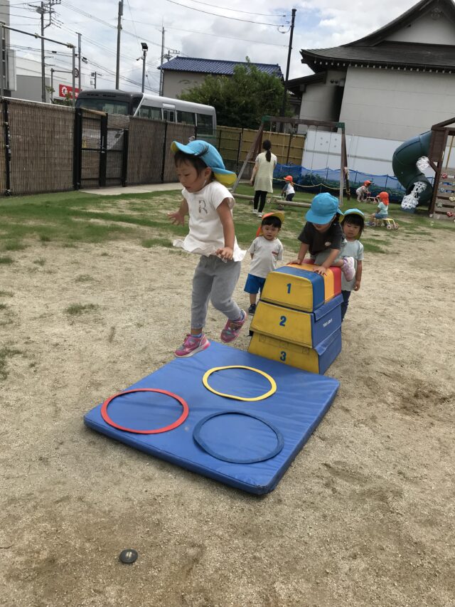 2025.08.18 保育園の日常、誉田保育園 外遊び♪ 2・3歳児♪ 「よいしょ♪よいしょ♪」 マットを持ってなにするのかな・・・ 「みんなではこぼー」 「よいしょ♪よいしょ♪」 「おもたいけど がんばるぞー♪」 「うわぁ グラグラしておちそうだー」 保育者が色の指定をすると、色のフープの中にジャン~プ♪ 「はいったよ♪」 次にバルーンをだしてみると・・・ 大きいカラフルな色のバルーンに興味津々♪ 「ふわぁってなったね」 「たのしい~♪」 2.・3歳のお友だちは、毎日、先生とたくさん楽しく遊んでいますね♪