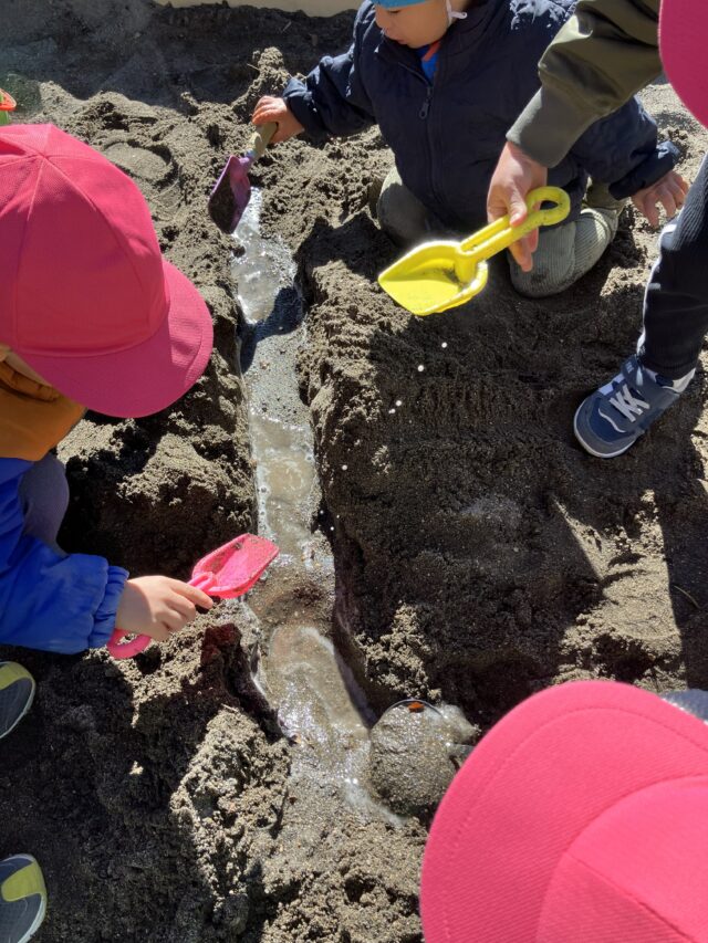 2026.01.23 保育園の日常、西馬込小規模保育園 夢中 1.2歳児クラス 今日は日差しもあり寒い中でも陽が当たる場所は気持ちのいい陽気でした。 公園に行き砂場で遊びました。 山を作り お!川が出来たぞ!! 子どもたちは興味津々。 夢中になって砂場遊びをしておりました。