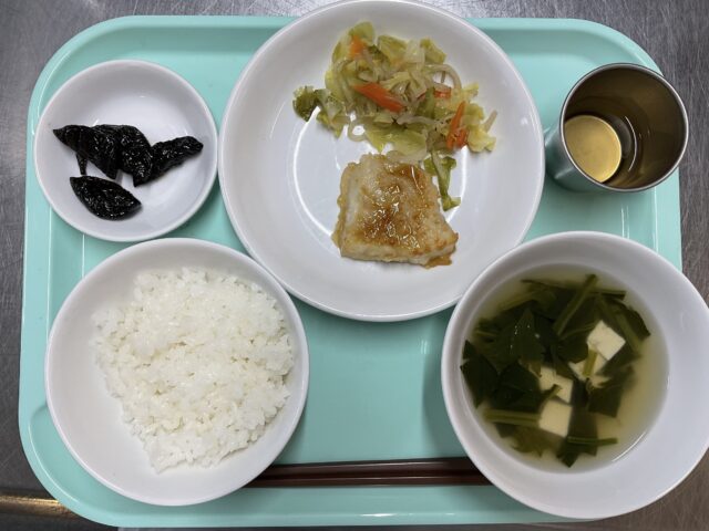 2025.12.19 ある日の給食 大岡山園 給食 御飯、かじきのガーリックステーキ、野菜炒め、豆腐のくずあんスープ、プルーン 普段野菜を食べない子もよく食べていました。ガーリックステーキも好評でした。