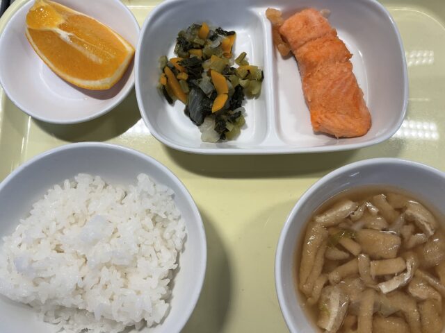 御飯、さけのムニエル、野菜炒め、キャベツのみそ汁、オレンジ