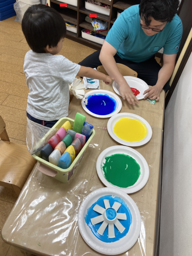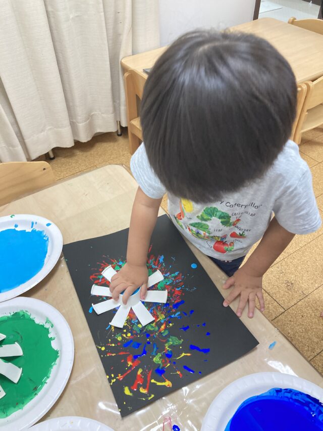2025.08.5 保育園の日常、西馬込小規模保育園 大輪の花火 2歳児クラス 花火の製作を行いました。 準備段階から 「あか」「あお」「きいろ ばなな」と言いながら 楽しみに 見ています。 1番初めにやってるよ! 色々な色をペタペタ きれいにできました。