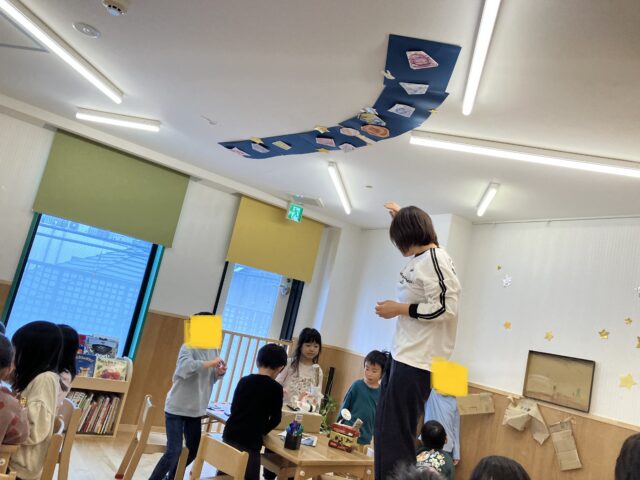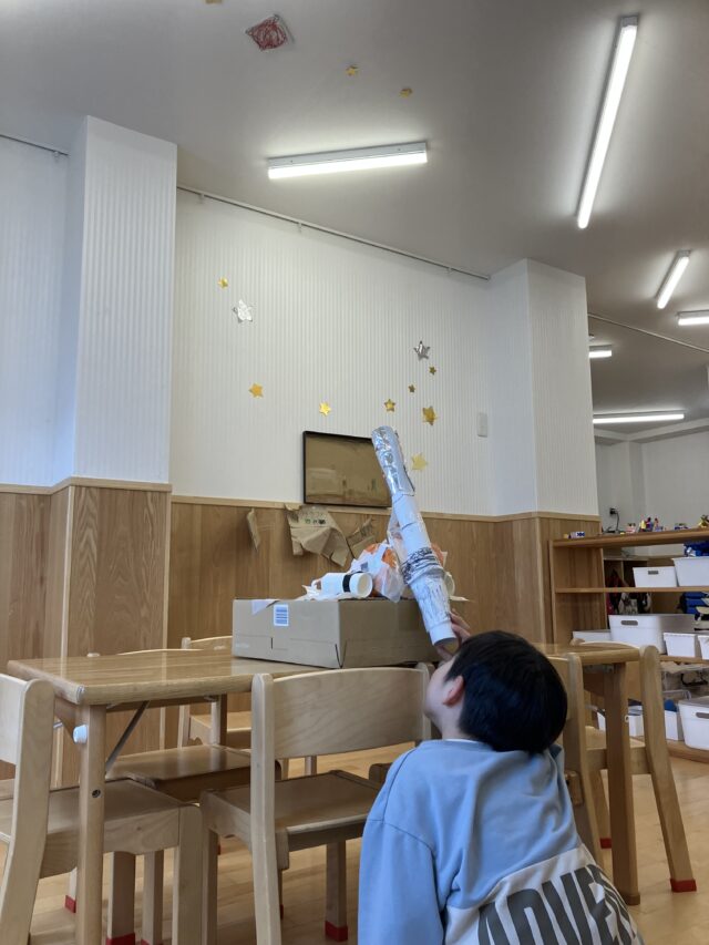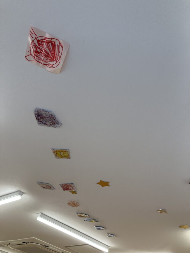 2025.11.20 保育園の日常、大岡山園 天井に宇宙!? これは…??? 廃材で望遠鏡を作っていた子どもたち。 覗く先には惑星が必要だ!!!と発展し、大急ぎで作っていました。 そして天井へ。 保育士は「いや、これはこの惑星の間で!!」などと 子どもたちに指示されながらも必死に惑星順に貼りました。 まだまだ貼りたい惑星があるようで…今後の天井に注目です!!