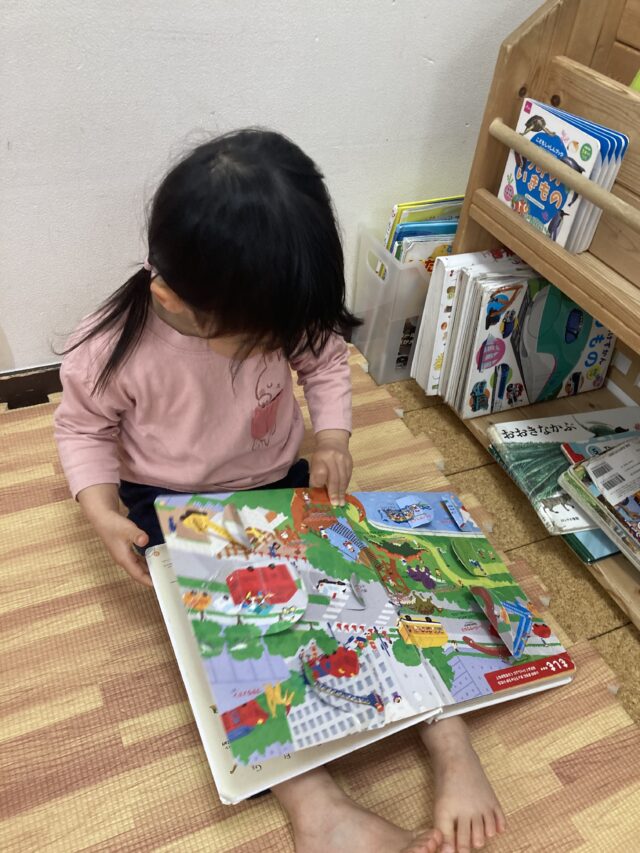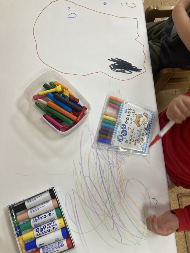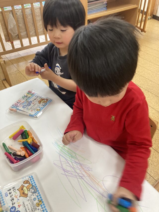 2026.03.17 保育園の日常、西馬込小規模保育園 好きな遊びを楽しむ 2歳児クラス 今日の2歳児クラスは 好きな遊びを存分に楽しんだ後に 公園へ出かけました。 お絵描きがしたかった2人は きちんと担任に思いを伝え 存分にお絵描きを楽しみました。 「せんせい みて ベンツ!」と教えてくれました。 ベンツ!!! 車に詳しいね~ 静かに 好きな絵本を見ています。