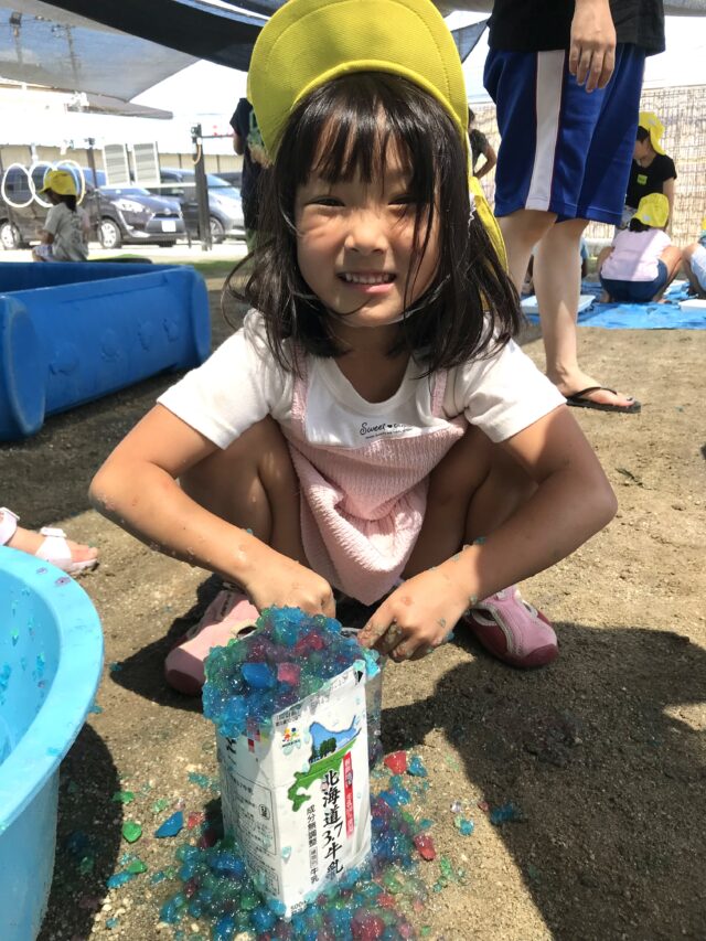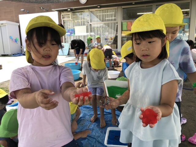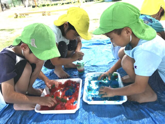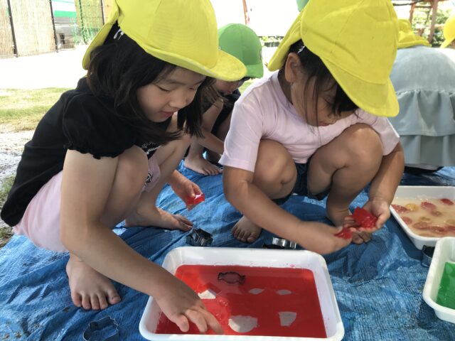 2025.07.28 保育園の日常、誉田保育園 寒天遊び☆4.5歳児 大きい組さんも寒天遊びが始まりました。 上手に型抜きできました。美味しそう~カップに詰めてパフェにしました 「おおきいのも出来たよ~」プルプル寒天を崩さないように上手に型抜きできました 「気持ちいいんですけど~」冷たい感触が気に入ったようです 「何度も挑戦」難しいけどあきらめずに頑張ります 「レインボーかき氷の出来上がり」美味しそうですね~ 「もうはいりません」押し込めば、押し込むほどくずれてしまう寒天の性質を楽しんでいました 「これ、きもちいいね~」「ぐちゃぐちゃが面白い~」崩すことに夢中でした