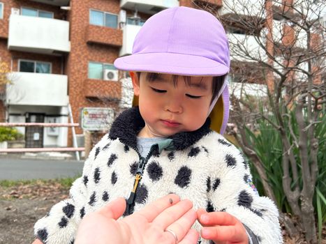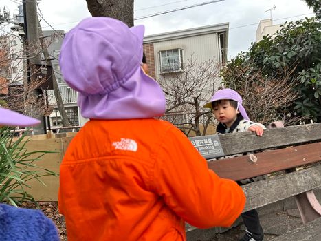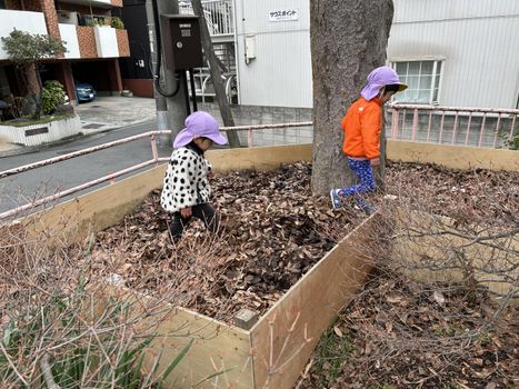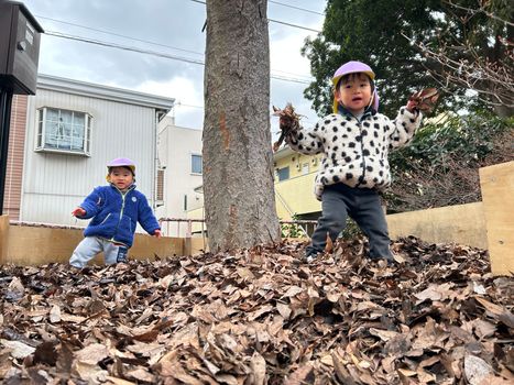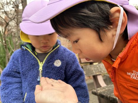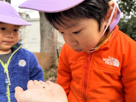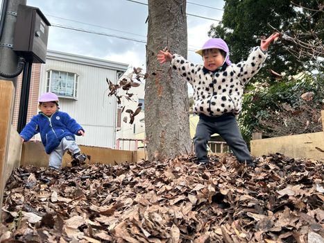 2026.03.9 保育園の日常、菊名園 小さな虫との出会い💕もうすぐ春ですね🌸 カサ、カサ、カサ🍂 カサ、カサ、カサ🍂の音がたまらない! 葉っぱがいっぱーい! そーれ!ひらひらひら🍂 と、そこに✨???ちっちゃ~い! 寝てるの?じっくり観察! あっ!動いた!起きた? おーい!どうしたの? ダンゴムシって言うんだって!今起きたんだよ~😊 あそびはまなび!毎日いろいろな発見があります~😊✨