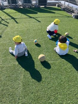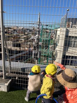 2025.12.2 保育園の日常、北千束園 屋上あそび 屋上に到着すると、「わー!」と声を出して走る子,ハイハイを一生懸命頑張っている子、それぞれの姿が見られました。 つかまり立ちやフェンスに掴まっている子ども達の側に保育者が近寄り、指をさして「富士山が見えるよ」と伝えるとジッと眺めていました。