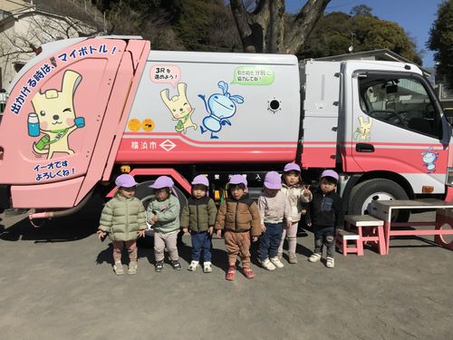 2025.05.8 保育園の日常、第一・第二横浜楠町園 年度末恒例のゴミぽいぽい!体験 みんなが大好きなゴミ収集車が遊びに来てくれました。 ごみ収集車の中にゴミを入れる体験やゴミの分別ゲームを楽しみました。 ごみ収集車の中にえいっ!ばいばーい! どっちの箱に入れるのかな? 青と白の2色の袋をみんなで一生懸命に運びます。 こっちの箱かな?と悩みながらも箱の中がいっぱいになるまで運ぶことが出来ました! 最後はお兄さんとタッチ!「ありがとう!」