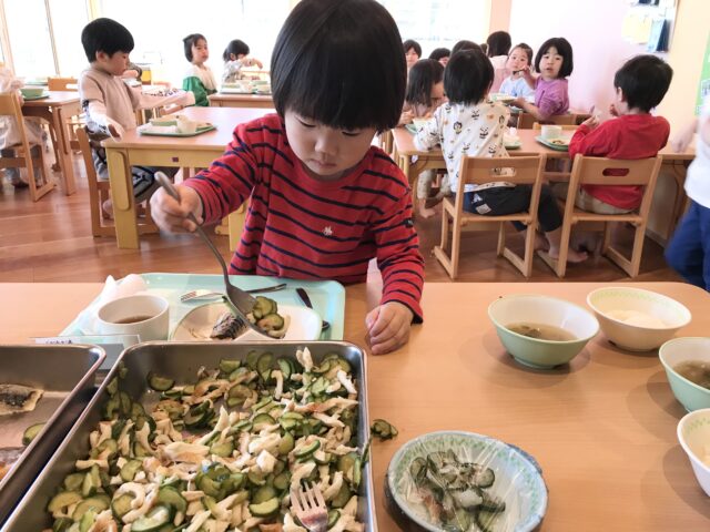 異年齢で一緒に座ることもあるため、箸を使って食べることへのあこがれも出てきます