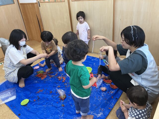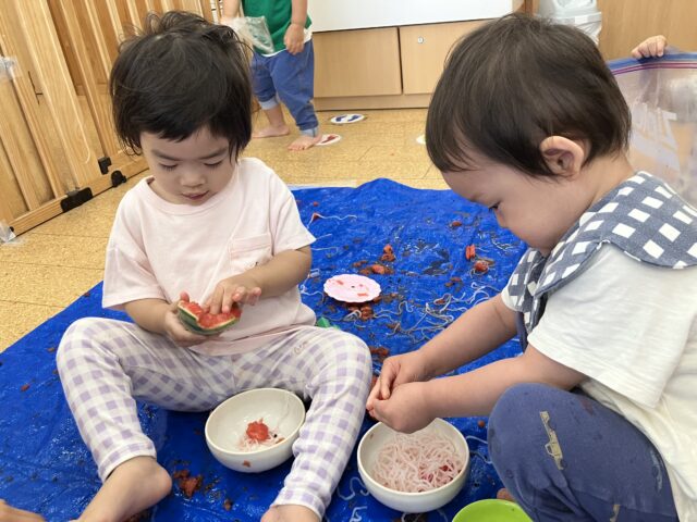 夏の果物、すいかを触ったり、はるさめを触ったりして遊びました。