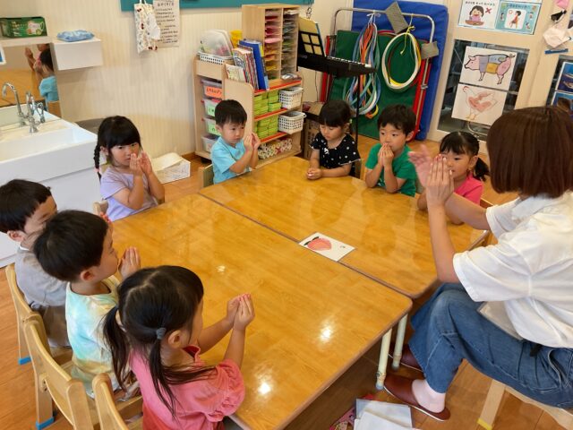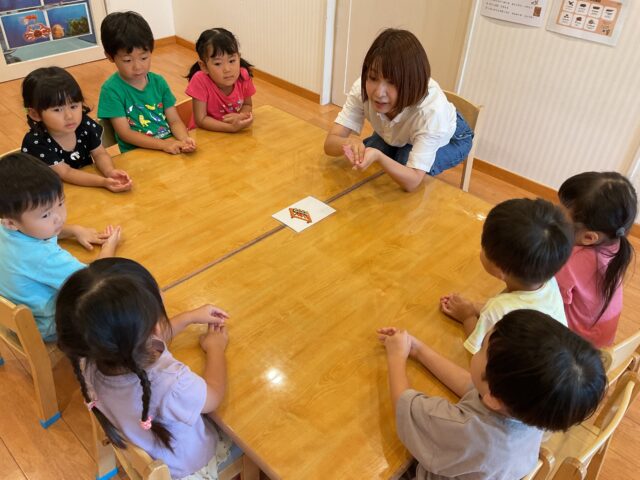 2025.07.16 保育園の日常、東葛西園 手話で食べ物を表現 まんぼう&いるか組のみんなはいろんな食べ物を教えてもらったよ~ カードをひいて 手話ではどういう感じなのかな~ 前回の果物を覚えてたね~♪ 次回も楽しみ~