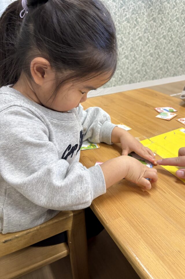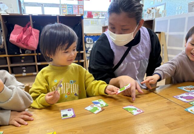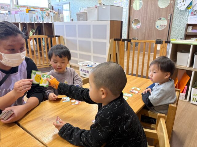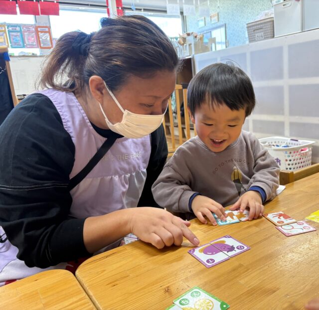 2026.01.31 保育園の日常、誉田保育園 文字(絵)あそびゲームをしたよ♪2歳児♪ カードゲームに興味を持った2歳児のお友だち♡文字(絵)合わせゲームに挑戦している様子を紹介しますね♪ 「このカードとぴったり合うカードはどれかな・・・!」 もしかしたら、ぼくのかな・・・♪あったね! カードの向きをそろえて・・・ ぴったりみっーけ!!! ぴったりが見つかると嬉しいね♡ やったあ♡ これだけたくさんの、ぴったりなカードが出来上がりました♡
