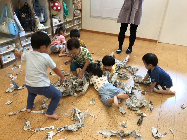 2025.09.5 保育園の日常、東葛西園 新聞紙遊びは∞ この日は、新聞紙であそんだよ~ みんなは、新聞紙をどんなふうにして遊んだかというと。。。 並べたり。。。寝転んだり 秘密基地? え?誰? 最後は~ わちゃわちゃわちゃ~ みんなで、きれいにお片付けしましたとさ♡