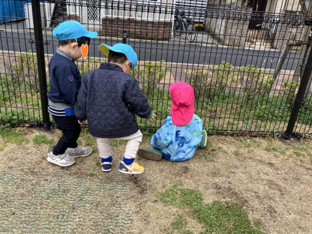 ホトケノザやクローバーがあると聞いて、地面をよく見て探しています。