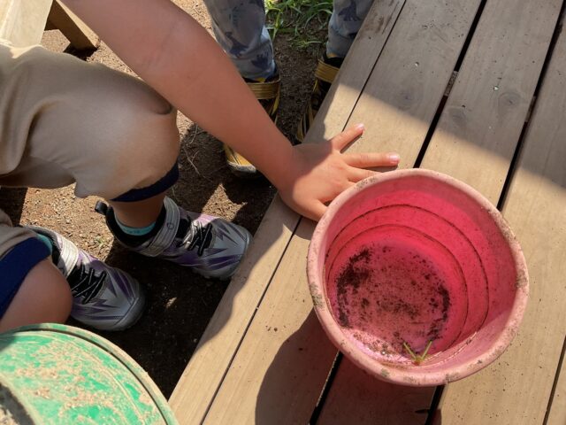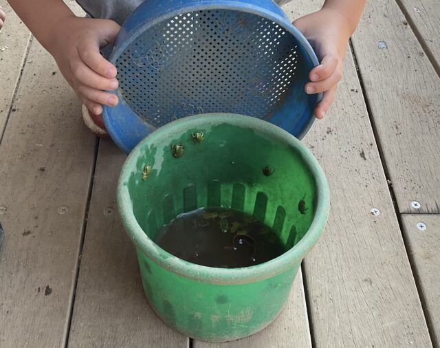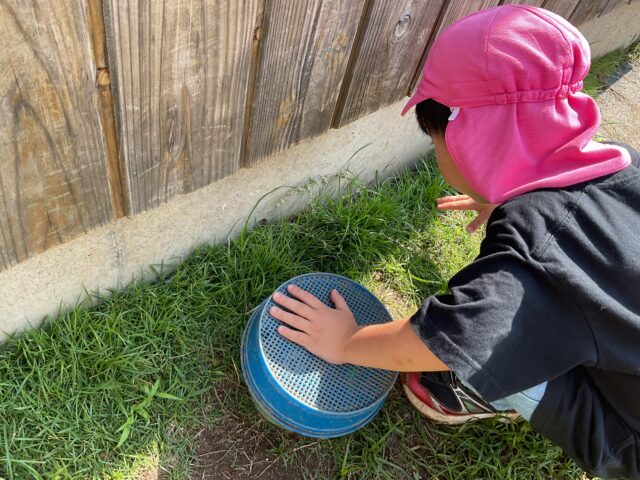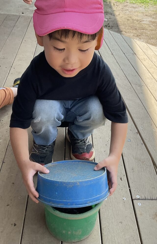 たくさんのカエルを見つけてお手製のカゴに入れて、小さなお友だちや保育者に見せてくれました。