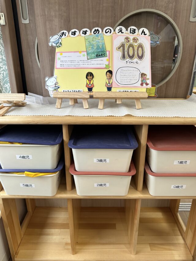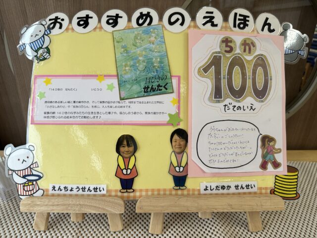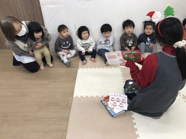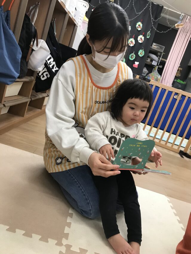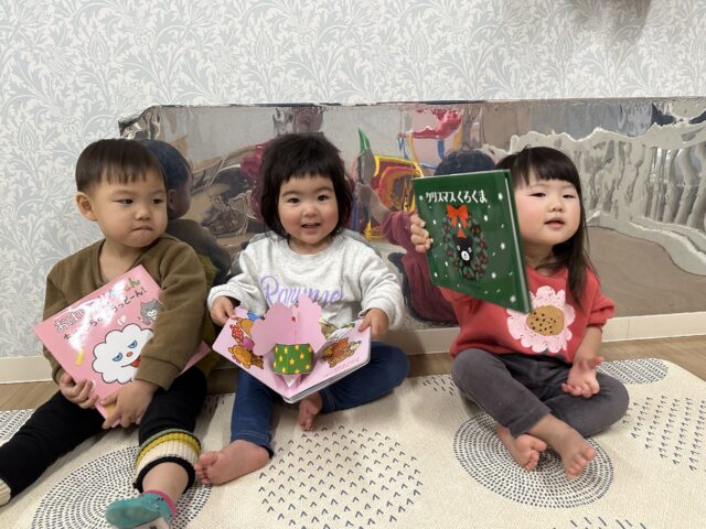 2025.12.31 保育園の日常、誉田保育園 未満児クラスの絵本時間📘 みんな大好き♡朝の絵本タイム!もうすぐクリスマスのなので、クリスマスの絵本♡ 「クリスマスツリーだ!!」「この絵本おもしろいなぁ♡」 保育者の膝の上に座って見る姿も♡ 各クラス、お気に入りの絵本を見せてくれました♪「私のおすすめは、これ~♪」 おすすめの絵本といえば・・・今週の職員のおすすめ絵本は園長先生と5歳児の担任の先生です♡「14ひきのせんたく」「ちか100だてのいえ」おすすめなので、ぜひ読んでね♡ 子どもたちも絵本の紹介コーナーに興味深々♡ 「あれれ…?何もないよ・・・」何かに気づいたこどもたち。視線の先には・・・ 貸し出し絵本が空っぽでした!!また来月、新しい絵本が届く予定です♪今年もたくさん絵本を読んだこどもたち♡来年はどんな絵本が届くか楽しみだね♡