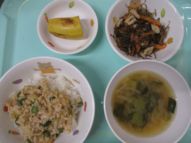 みんな大好きなひき肉納豆丼です。保育室に行き、子どもたちの給食の様子を見て回っていると、「おいしい!」とほとんどのお友たちが教えてくれました。余程美味しかったのか、先にご飯に乗っているひき肉と納豆の部分を全て食べてしまっているお友だちもいましたよ。