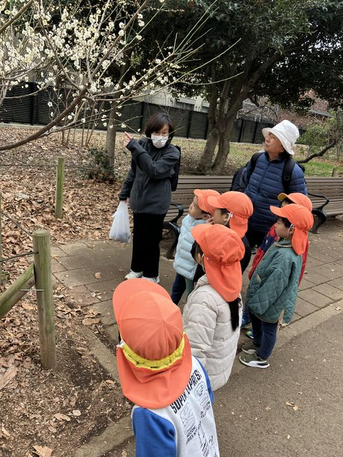 2026.03.2 保育園の日常、大岡山園 林試の森公園へ 年中クラスは林試の森公園に行ってきました。 テーマは光と影でしたが、残念ながら太陽が出ず... 目的を変えて、公園の植物を探しに行くことにしました。 桜と梅の違いを園長先生に教えてもらいました。