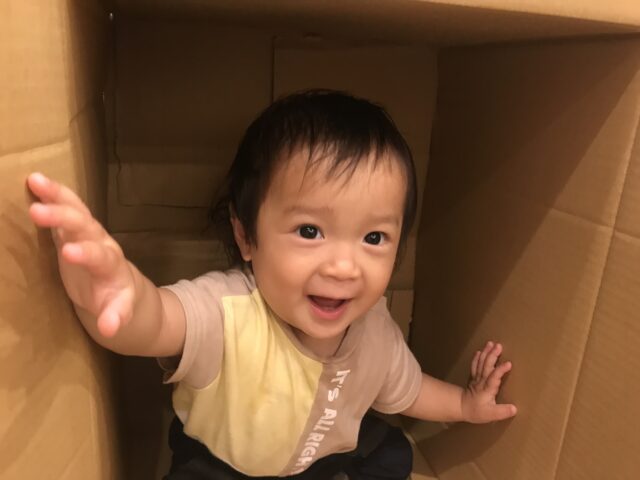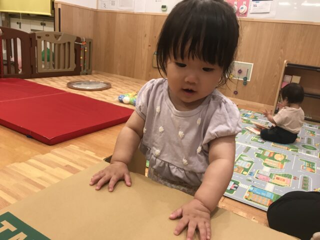 段ボールを使った遊びでは、保育者の真似をしてトントン叩いてみたり、いないいないばあ!と顔を出してみたりと可愛らしい姿が!