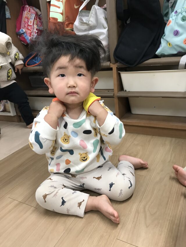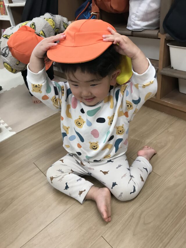牛乳が飲み終わると、園庭に行く準備♪帽子かぶれるかな!