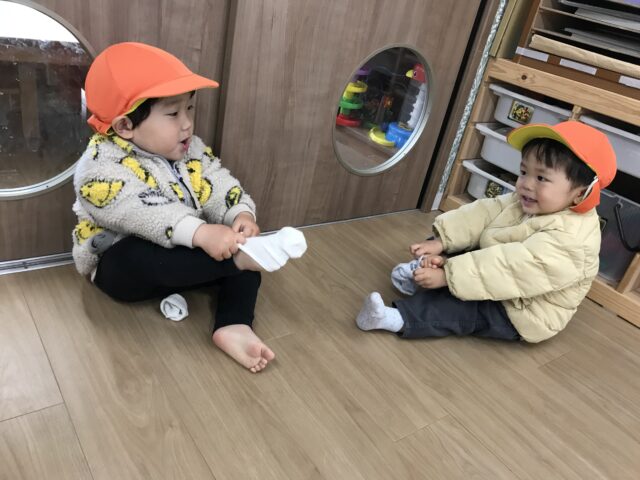 帽子をかぶって、ジャンパーを着て次は、自分で靴下をはく練習♪よいしょ♪