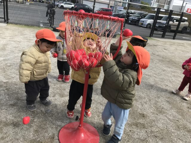 園庭にでると、なんと玉入れが・・・目をキラキラしてボールをえいっ♪届かない~・・・ポイっと かごの中もいっぱいになってきたね!