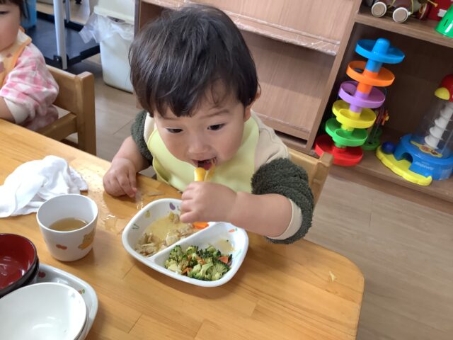自分でできることがたくさん増えて、たくさん遊んだあとの給食は美味しいね♡ 毎日元気いっぱいの1歳児です♪